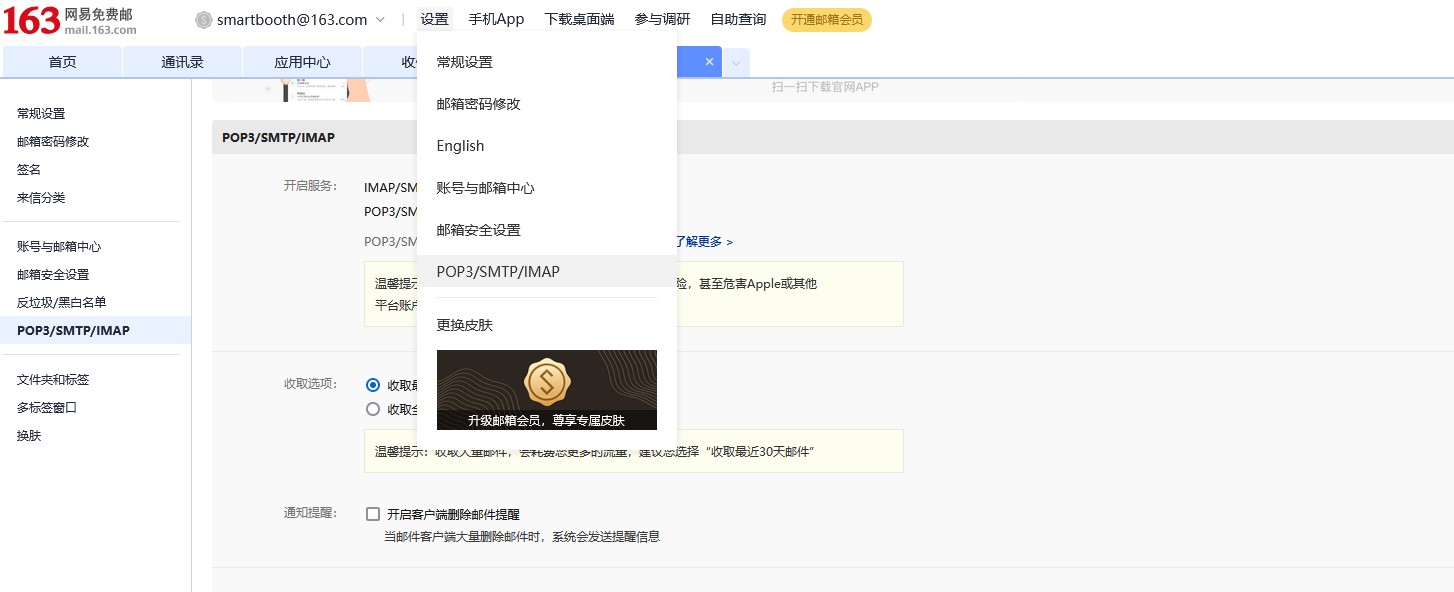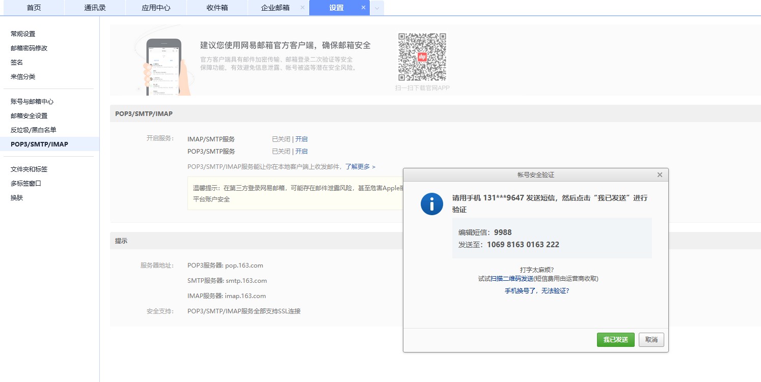 在 POP3/SMTP/IMAP 底下 开启服务: IMAP/SMTP服务 按 "开启"