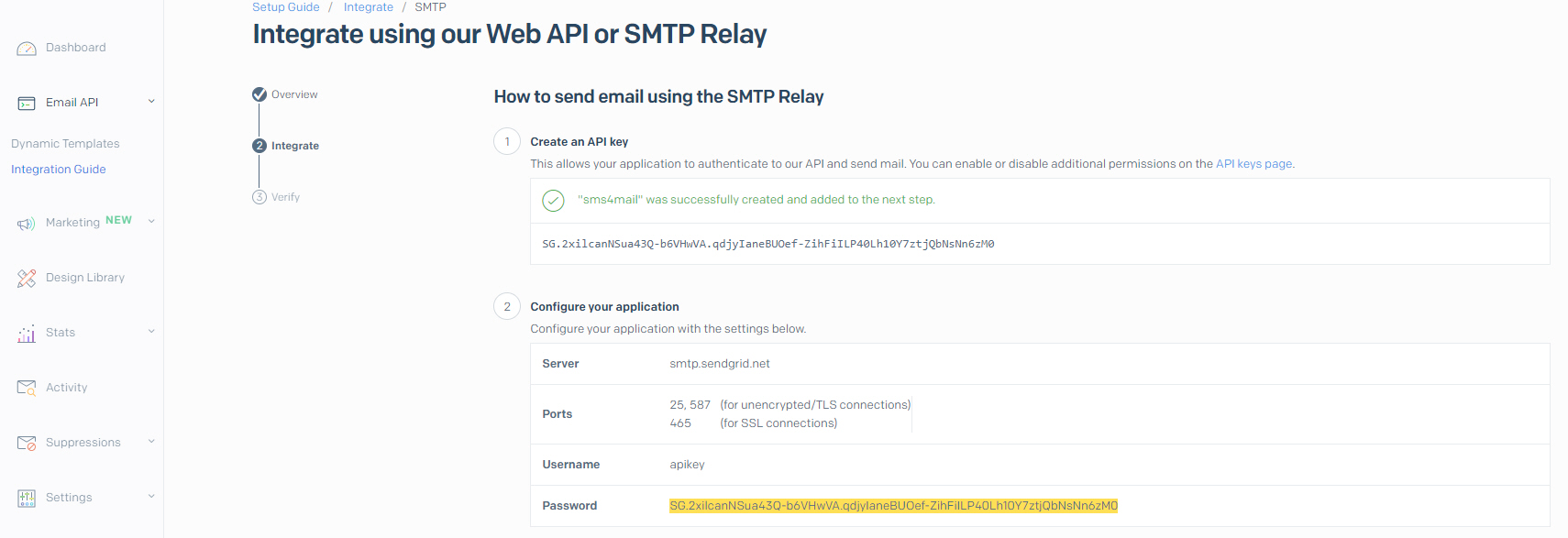 SMTP server : smtp.sendgrid.net PORT : 25 or 465